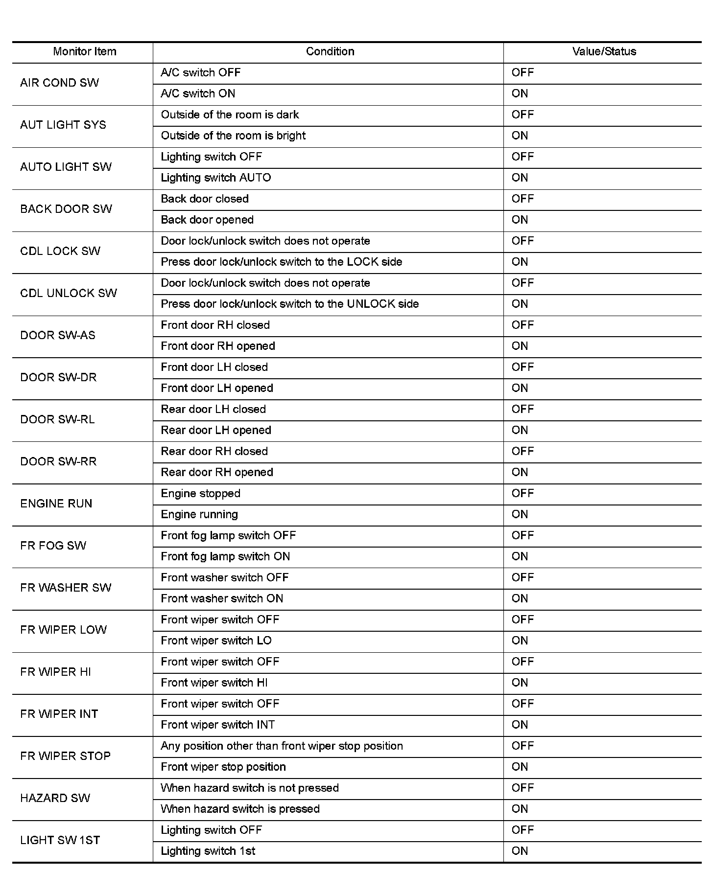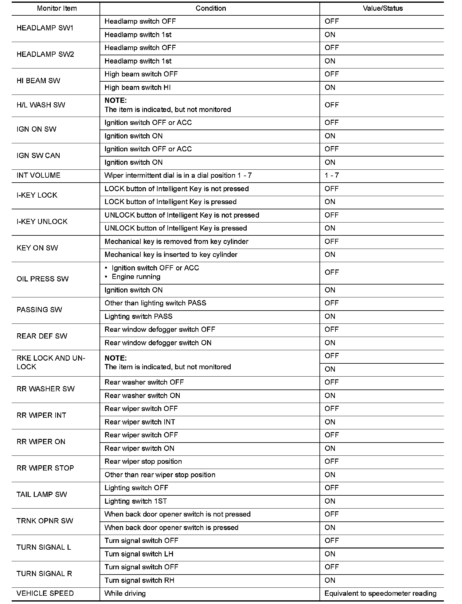 Pinout Values and Diagnostic Parameters