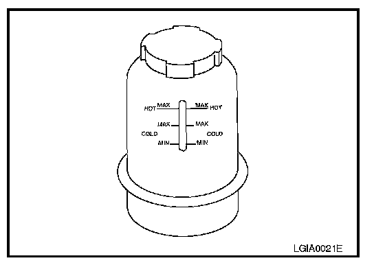 Check power steering fluid level with engine off, referring to the scale on reservoir tank.