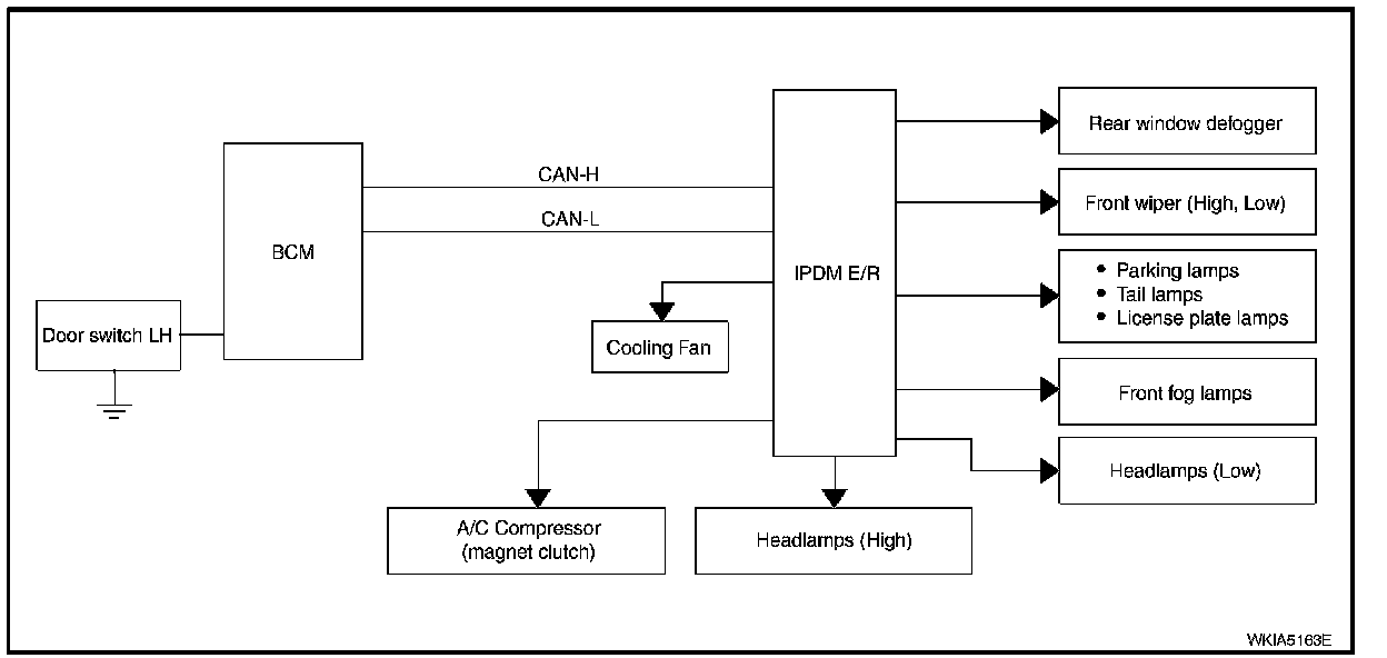 - IPDM E/R starts the auto active test with the door switch signals transmitted by BCM via CAN communication. Therefore, the CAN communication line between IPDM E/R and BCM is considered normal if the auto active test starts successfully.