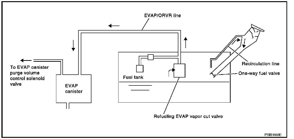 When the refueling has reached the full level of the fuel tank, the refueling EVAP vapor cut valve is closed and refueling is stopped because of auto shut-off. The vapor which was absorbed by the EVAP canister is purged during driving.