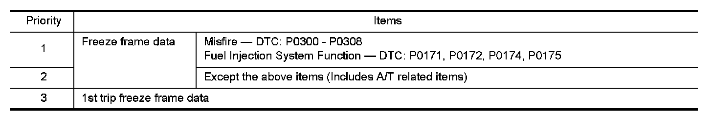For example, the EGR malfunction (Priority: 2) was detected and the freeze frame data was stored in the 2nd trip. After that when the misfire (Priority: 1) is detected in another trip, the freeze frame data will be updated from the EGR malfunction to the misfire. The 1st trip freeze frame data is updated each time a different malfunction is detected. There is no priority for 1st trip freeze frame data. However, once freeze frame data is stored in the ECM memory, 1st trip freeze data is no longer stored (because only one freeze frame data or 1st trip freeze frame data can be stored in the ECM). If freeze frame data is stored in the ECM memory and freeze frame data with the same priority occurs later, the first (original) freeze frame data remains unchanged in the ECM memory.