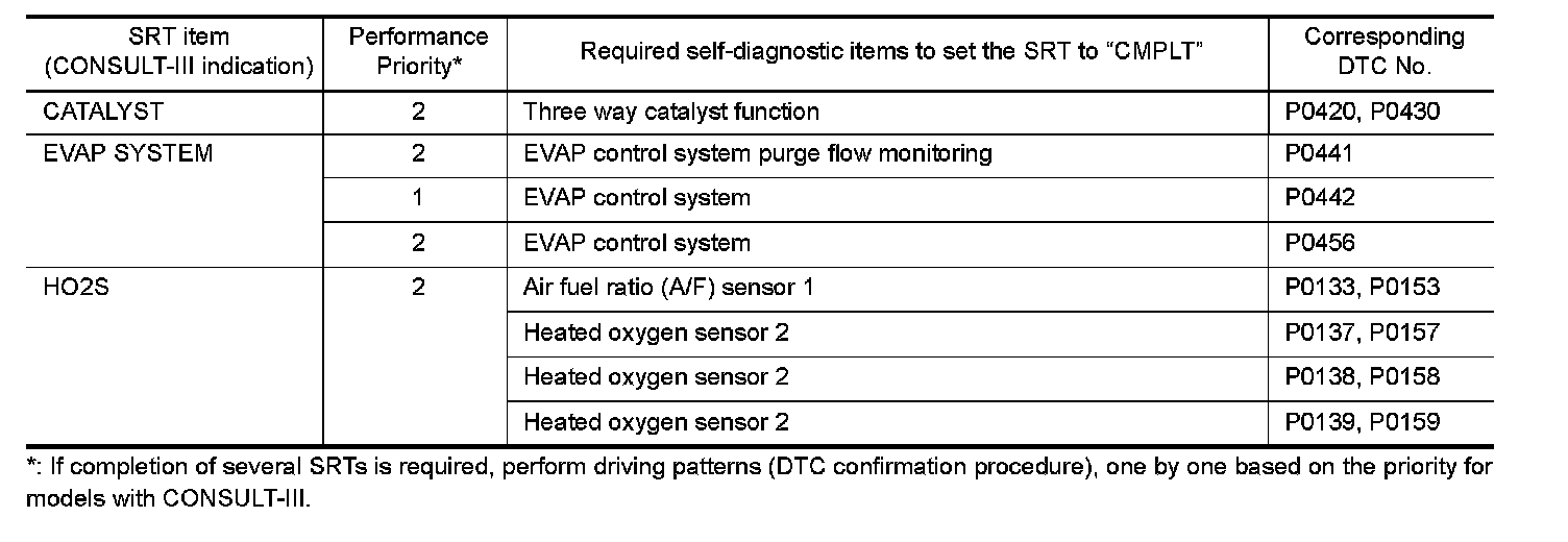 To set all SRT codes, self-diagnosis for the items indicated above must be performed one or more times. Each diagnosis may require a long period of actual driving under various conditions.