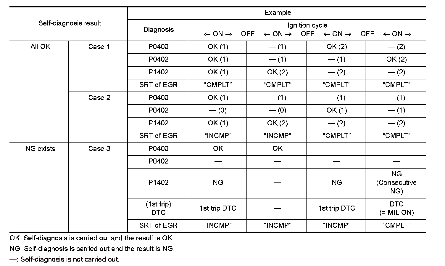 SRT is set as "CMPLT" after self-diagnosis has been performed one or more times. Completion of SRT is done regardless of whether the result is OK or NG. The set timing is different between OK and NG results and is shown in the table below.