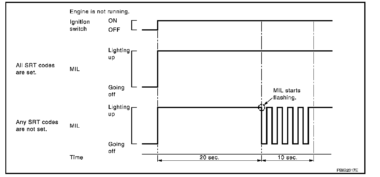 - When any SRT codes are not set, MIL will flash periodically for 10 seconds.