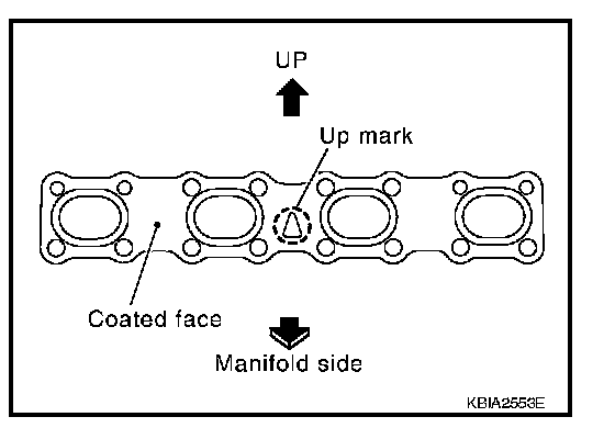 - Install new exhaust manifold gasket with the top of the triangular up mark on it facing up and its coated face (gray side) toward the exhaust manifold side.