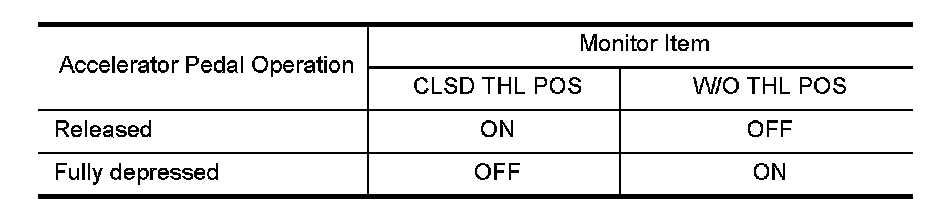 3. Depress accelerator pedal and read out the value of "CLSD THL POS" and "W/O THL POS".