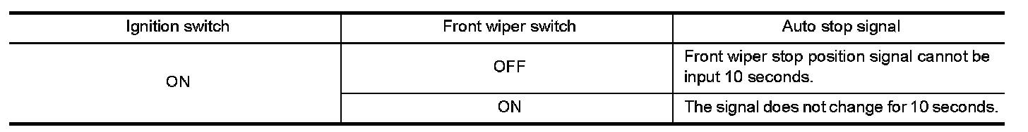 When a front wiper auto stop signal is in the conditions listed below, IPDM E/R stops power supply to wiper after repeating a front wiper 10 second activation and 20 second stop five times.
