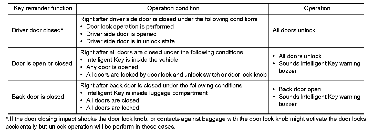 - When the key reminder function is operated when the back door is open/closed and the buzzers sound, if the following operations are performed, the key reminder function is cleared and buzzer sounds are stopped.