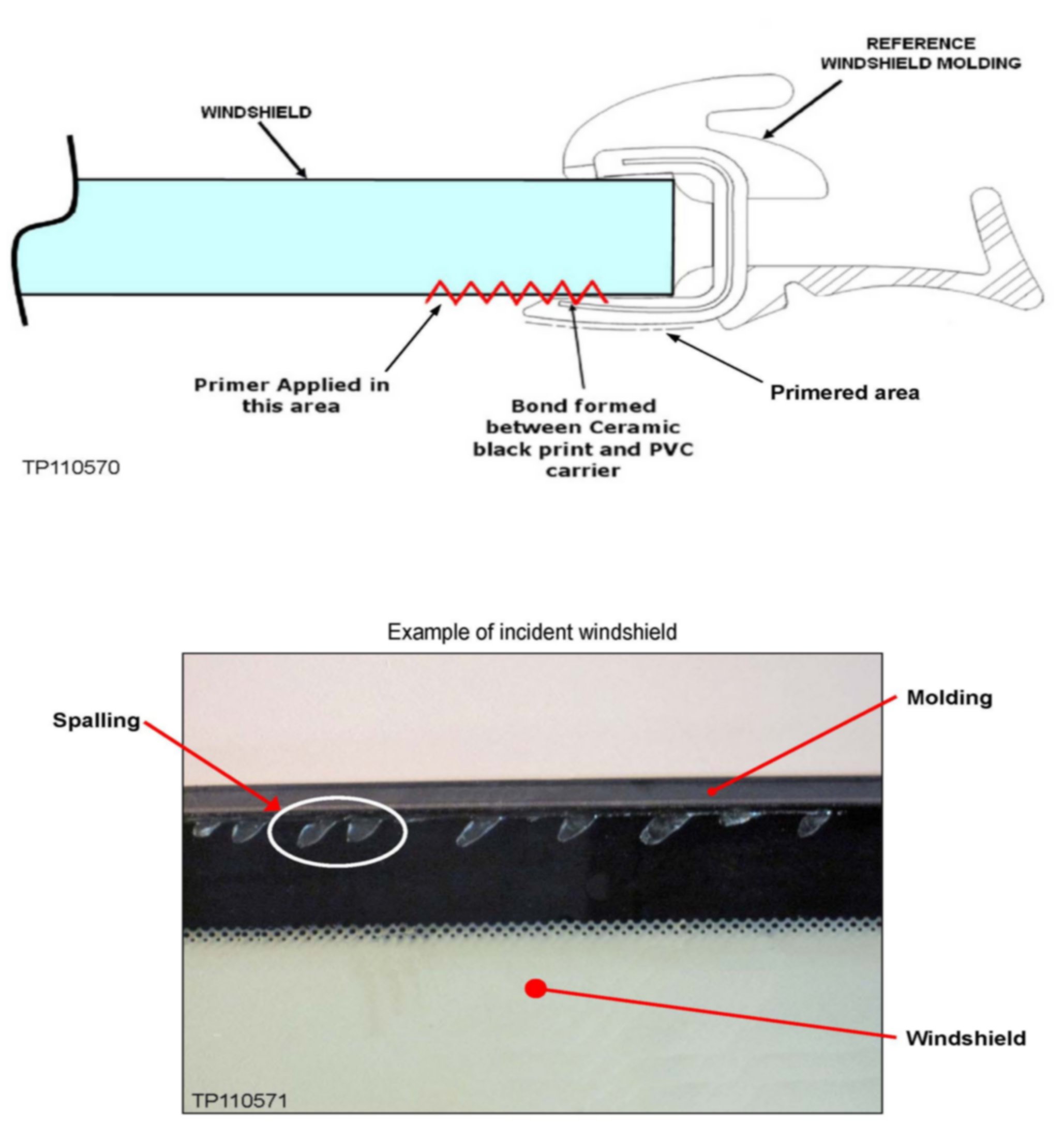 When a windshield is being installed in a 2004 - 2010 QX56 the glass primer has to dry (properly flash) for at least three (3) minutes. If the primer is misapplied and touches the PVC carrier of the windshield molding AND is not properly flashed the molding can become bonded to the glass. With this condition and during extreme temperatures the molding expands and contracts resulting in "spalling" (etching/peeling away of glass layers). This can result in windshield cracks over time refer to illustration below.