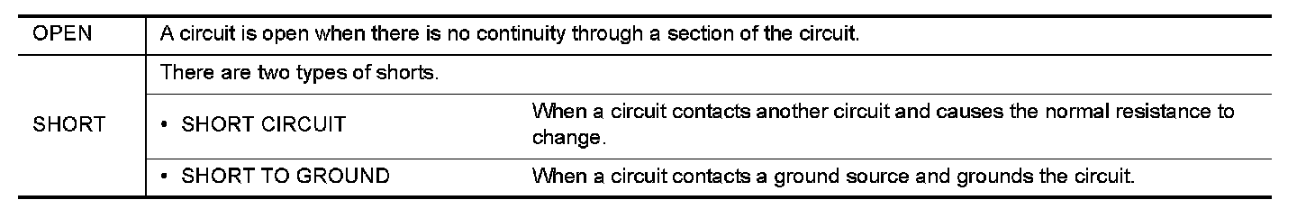 The continuity check is used to find an open in the circuit. The digital multimeter (DMM) set on the resistance function will indicate an open circuit as over limit (no beep tone or no ohms symbol). Make sure to always start with the DMM at the highest resistance level.