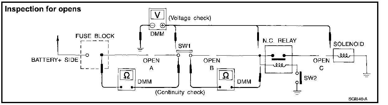 - Connect the other probe to the fuse block (power) side of SW1. Little or no resistance will indicate that portion of the circuit has good continuity. If there were an open in the circuit, the DMM would indicate an over limit or infinite resistance condition. (point A)