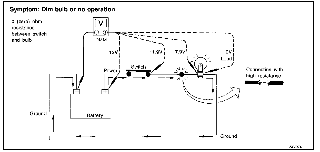 - Check the wire in the illustration. When measuring resistance with DMM, contact by a single strand of wire will give reading of 0 ohms. This would indicate a good circuit. When the circuit operates, this single strand of wire is not able to carry the current. The single strand will have a high resistance to the current. This will be picked up as a slight voltage drop.