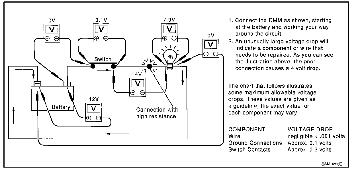 - The step by step voltage drop test can identify a component or wire with too much resistance.