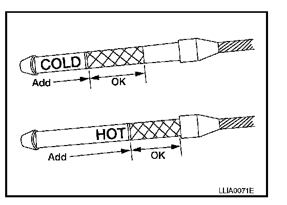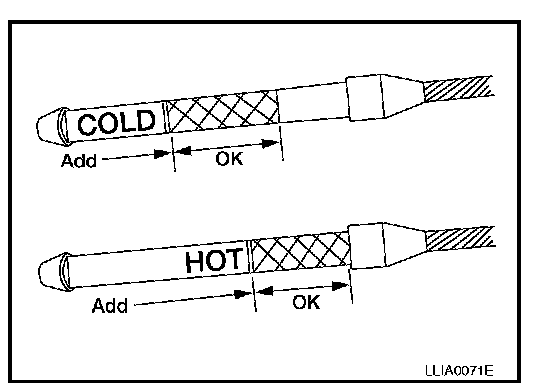 1. Before driving, the A/T fluid level can be checked at A/T fluid temperatures of 30� to 50� C (86� to 122� F) using the "COLD" range on the A/T fluid level gauge as follows: