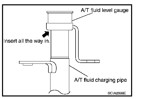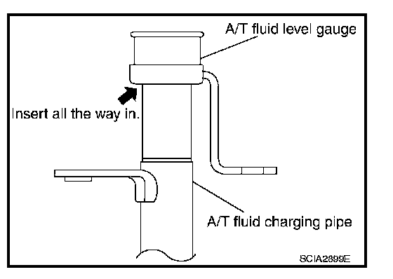 To check A/T fluid level, insert the A/T fluid level gauge until the cap contacts the top of the A/T fluid charging pipe, with the gauge reversed from the normal inserted position.