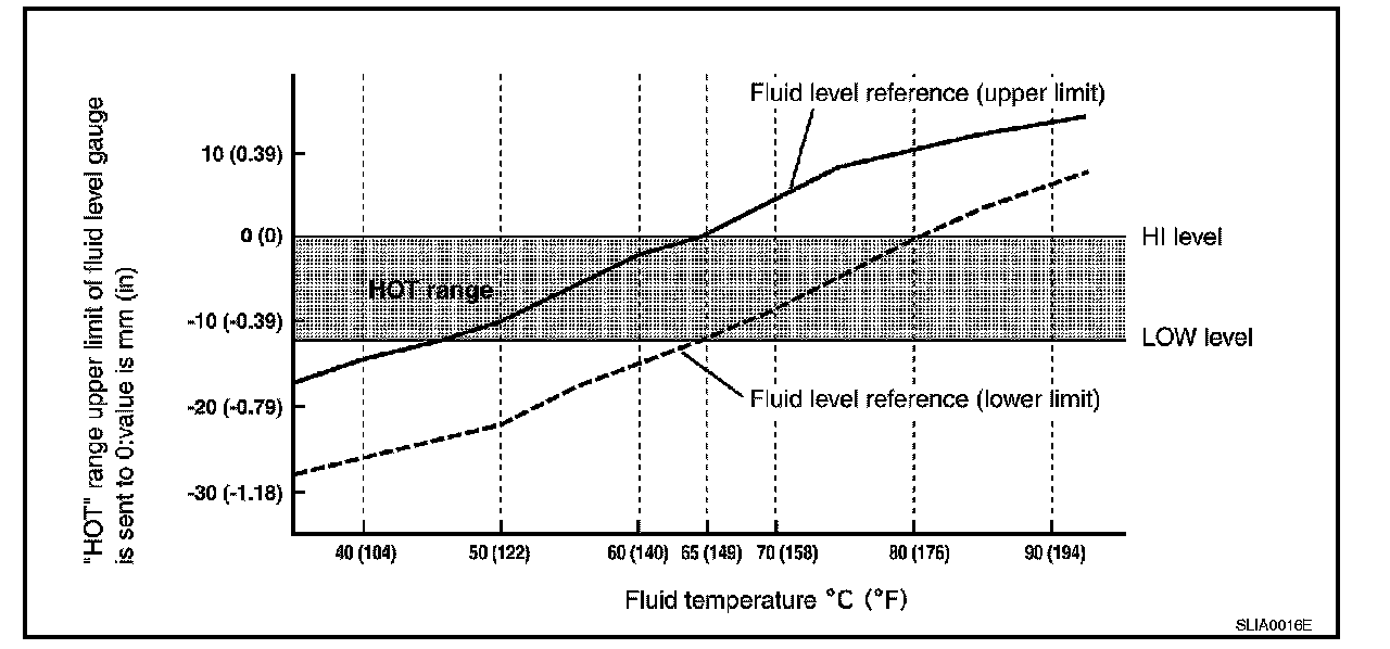 The A/T fluid level will be significantly affected by the A/T fluid temperature as shown. Therefore monitor the A/T fluid temperature data using the CONSULT-III.