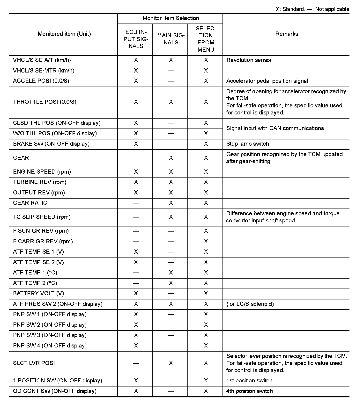 When the ignition switch is switched "ON", the A/T CHECK indicator lamp lights up for 2 seconds. As a method for locating the suspect circuit, when the self-diagnostics start signal is input, the memory for the malfunction location is output and the A/T CHECK indicator lamp flashes to display the corresponding DTC.