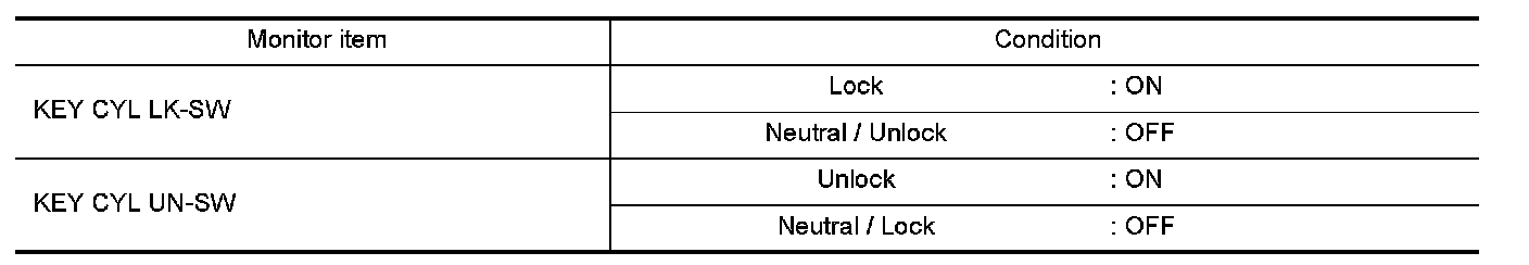 Check ("KEY CYL LK-SW", "KEY CYL UN-SW") in "DATA MONITOR" mode for "POWER DOOR LOCK SYSTEM" with CONSULT-III. Refer to Diagnosis System (Intelligent Key Unit).