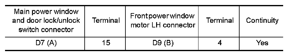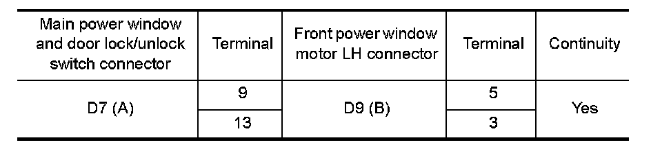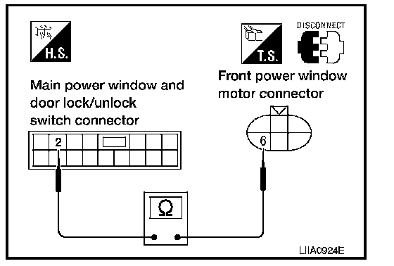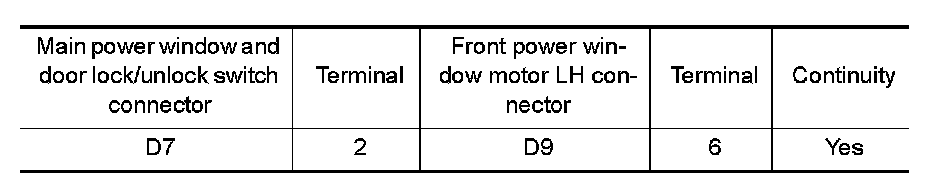 2. Check continuity between main power window and door lock/unlock switch connector and front power window motor LH connector.