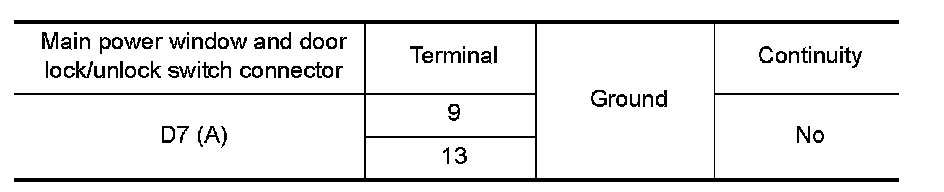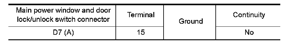 4. Check continuity between main power window and door lock/unlock switch connector and ground.
