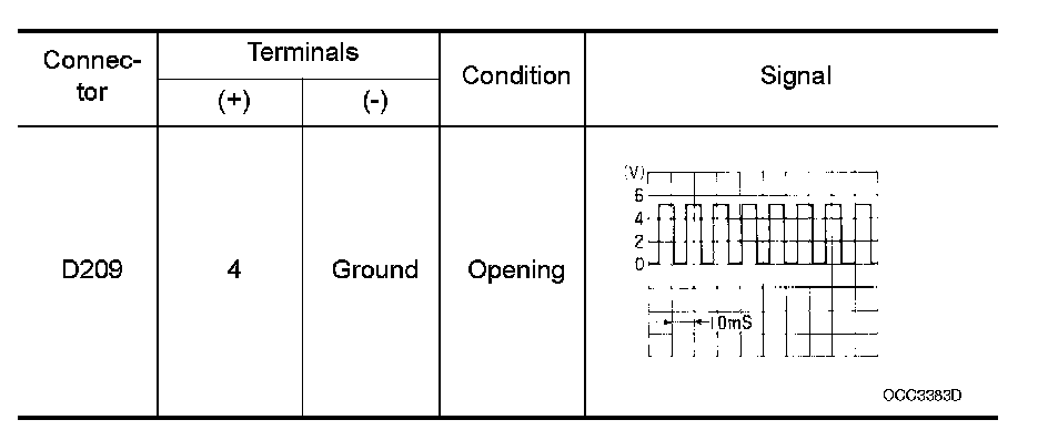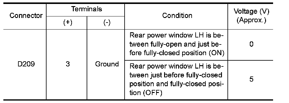 2. Check the signal between rear power window control unit LH connector D209 terminal 4 and ground with oscilloscope.