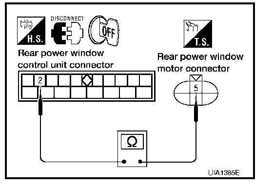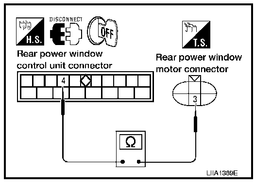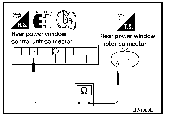 3. Check continuity between rear power window control unit LH or