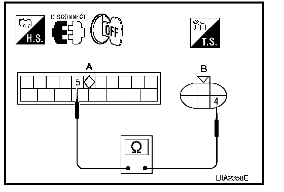 3. Check continuity between rear power window motor LH connector D204 (B) terminal 4 and rear power window control unit LH connector D209 (A) terminal 5.