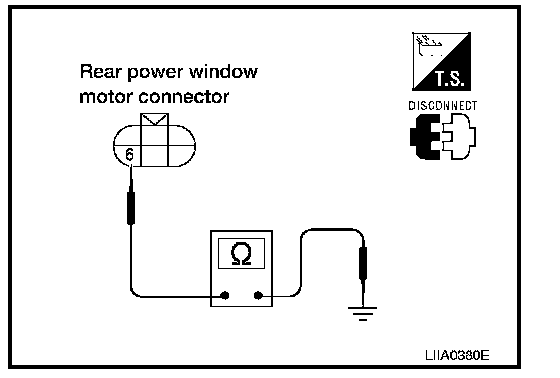 2. Check continuity between rear power window motor LH connector D204 terminal 6 and ground.