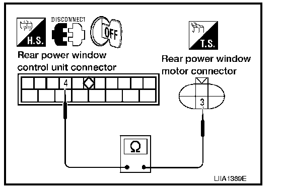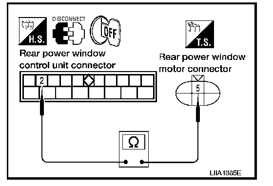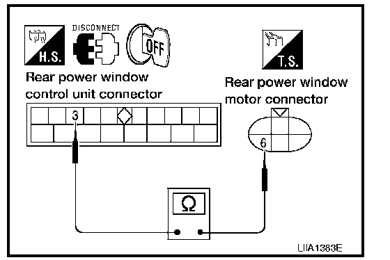 2. Check continuity between rear power window motor RH connector D304 terminal 6 and ground.