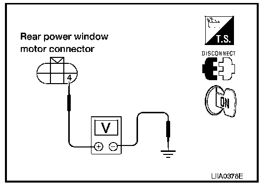 2. Check voltage between rear power window control unit RH connector and ground.