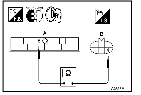 3. Check continuity between rear power window motor RH connector D304 (B) terminal 4 and rear power window control unit RH connector D309 (A) terminal 5.