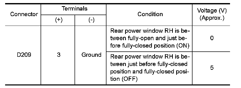 2. Check voltage between rear power window control unit RH harness connector D309 terminal 2 and ground.