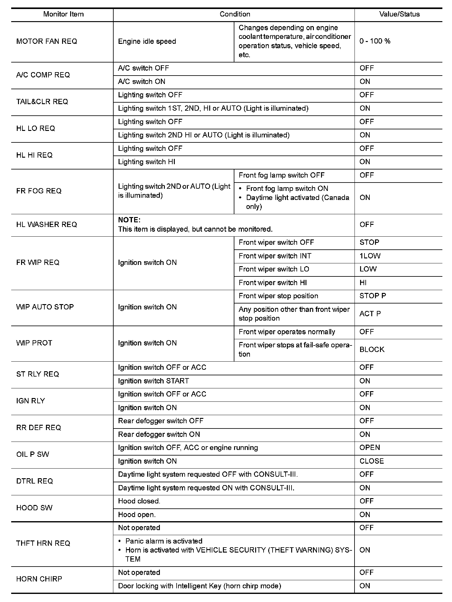 Pinout Values and Diagnostic Parameters