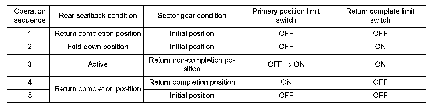 - In the condition that the rear seatback is raised (return completion position), the sector gear is in the initial position and the primary position limit switch and return complete limit switch are OFF.