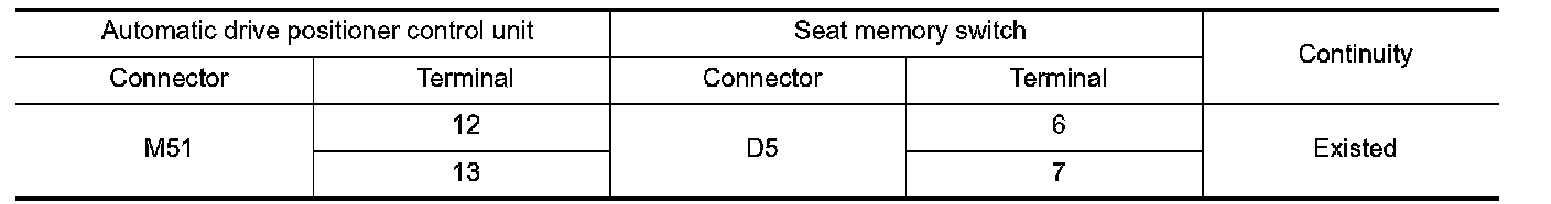 3. Check continuity between automatic drive positioner control unit harness connector and seat memory switch harness connector.
