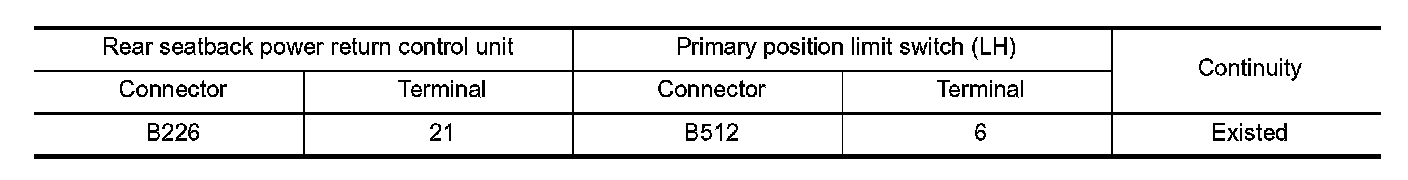 2. Check continuity between rear seatback power return control unit harness connector and primary position limit switch (LH) harness connector.