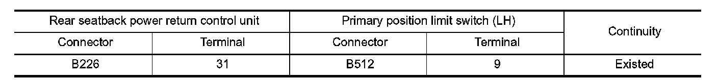 1. Check continuity between rear seatback power return control unit harness connector and primary position limit switch (LH) harness connector.