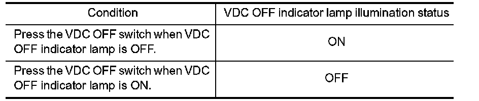 Turn ON/OFF the VDC OFF switch and check that the VDC OFF indicator lamp in the combination meter turns