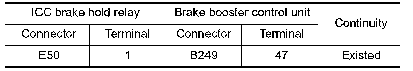 3. Check the continuity between ICC brake hold relay harness connector and brake booster control unit harness connector.