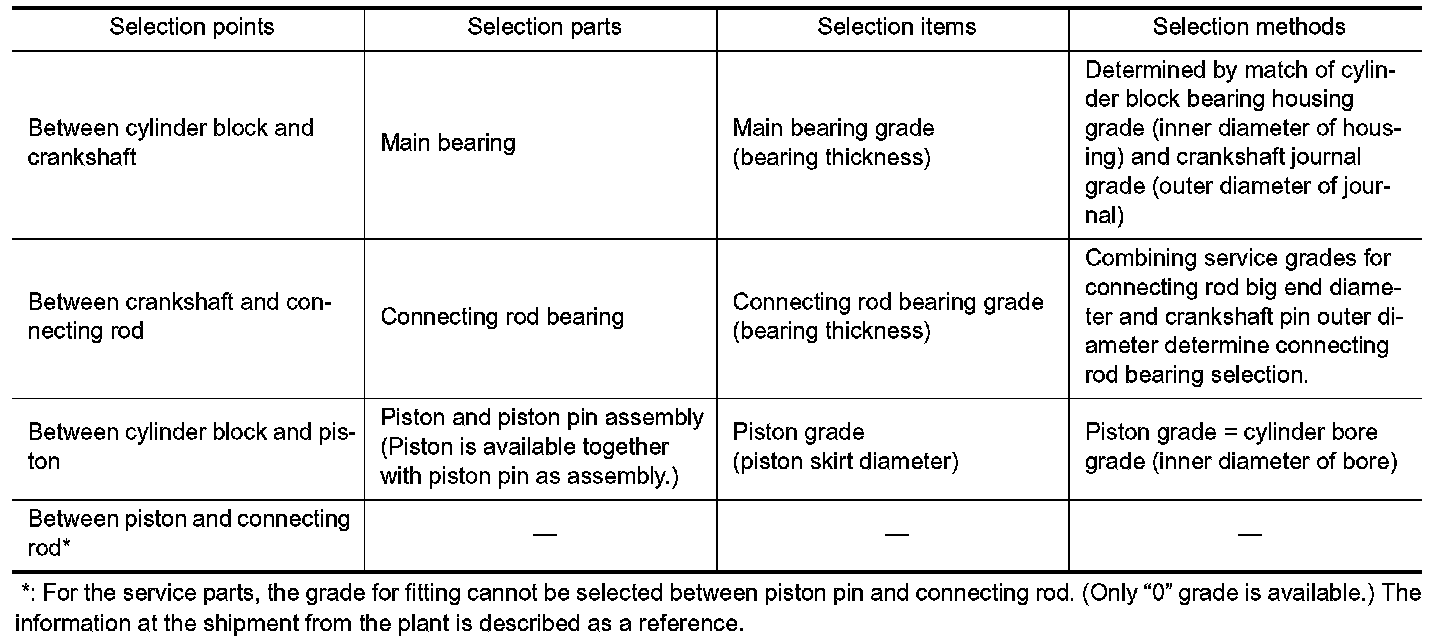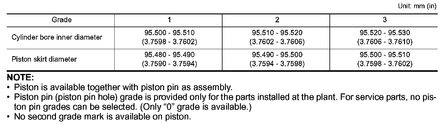 2. Determine the bore grade by comparing the measurement with the values under the cylinder bore inner diameter of the "PISTON SELECTION TABLE".