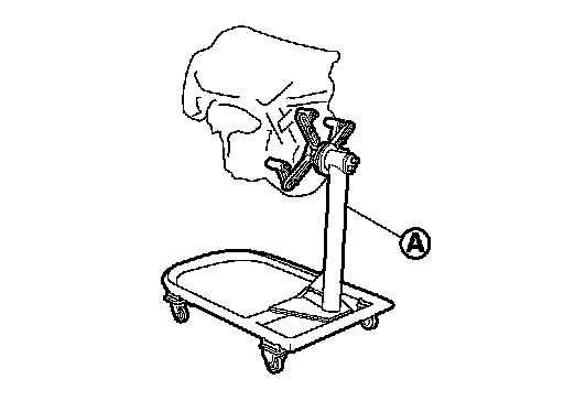 The figure shows an example of widely use engine stand (A) that can hold mating surface of transmission with drive plate removed.