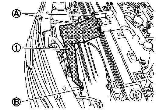 2. Remove mounting bolts (A) and nut (B), and then remove radiator core support bracket (1).