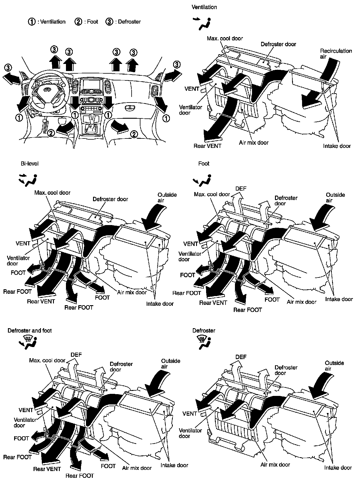 - Data sent from the unified meter and A/C amp. are selected according to data-based decisions made by the mode door motor, air mix door motors and intake door motor.