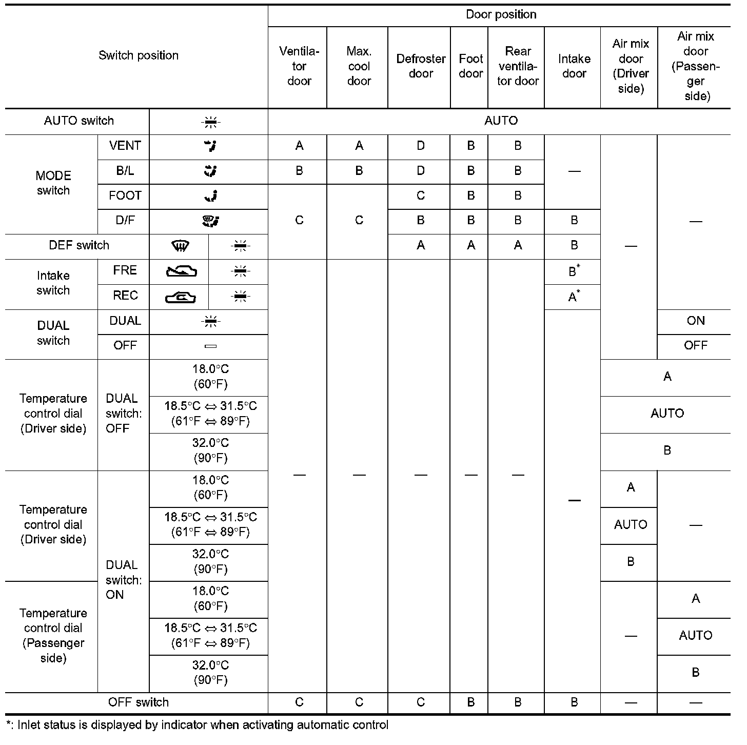 - The compressor, intake doors, air mix doors, mode doors and blower speed are automatically controlled so that the in-vehicle temperature will reach, and be maintained at the set temperature selected by the operator.