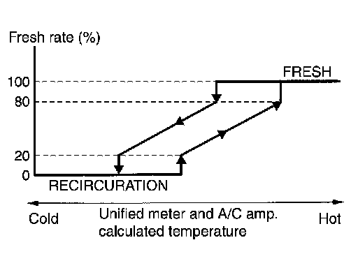 The intake door control judges intake door position based on the ambient temperature, the intake air temperature and the in-vehicle temperature. When shifting mode position D/F, when the DEF or OFF switches are pressed, or when A/C switch is OFF, the unified meter and A/C amp. sets the intake door at the FRE position.