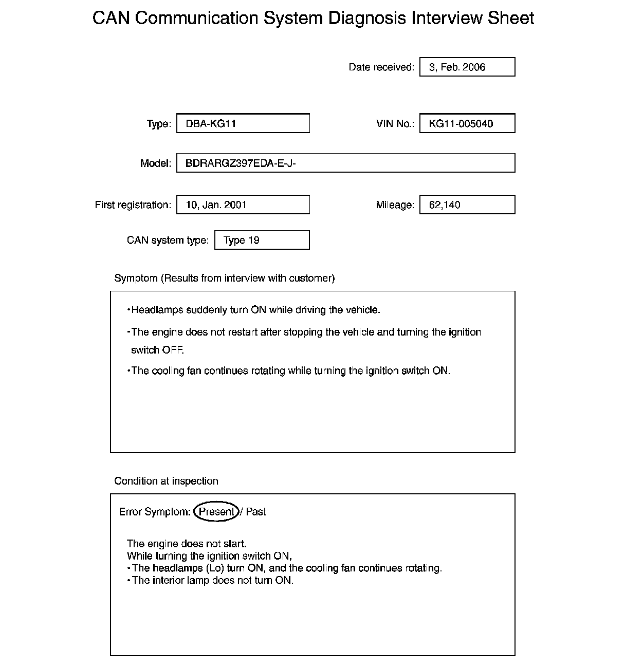 Fill out the symptom described by the customer, vehicle condition, and CAN system type on the interview sheet.