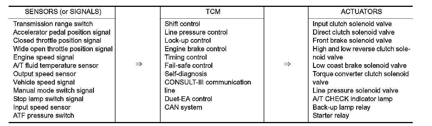 The A/T senses vehicle operating conditions through various sensors or signals. It always controls the optimum shift position and reduces shifting and lock-up shocks.