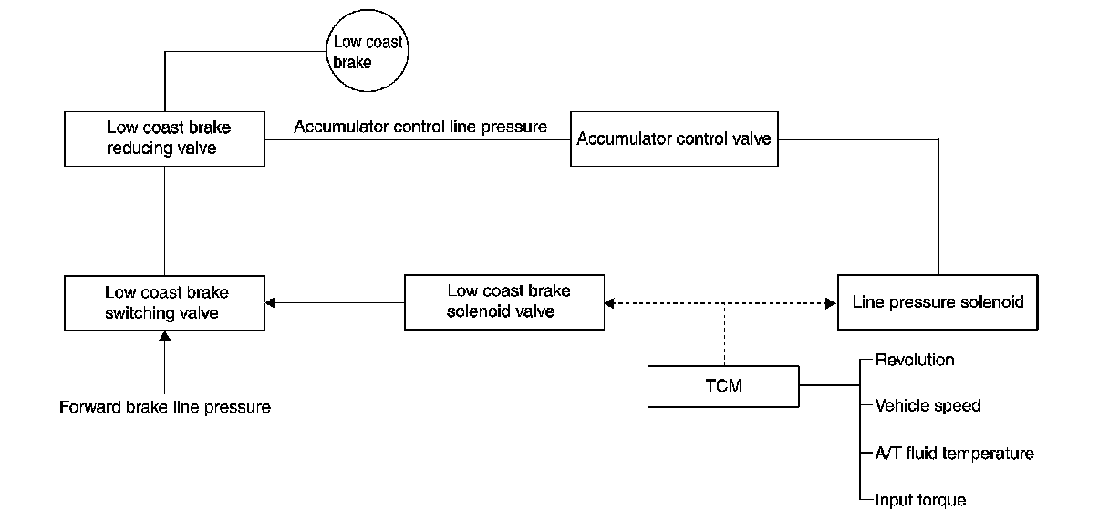 - The operation of the low coast brake solenoid switches the low coast brake switching valve and controls the coupling and releasing of the low coast brake.