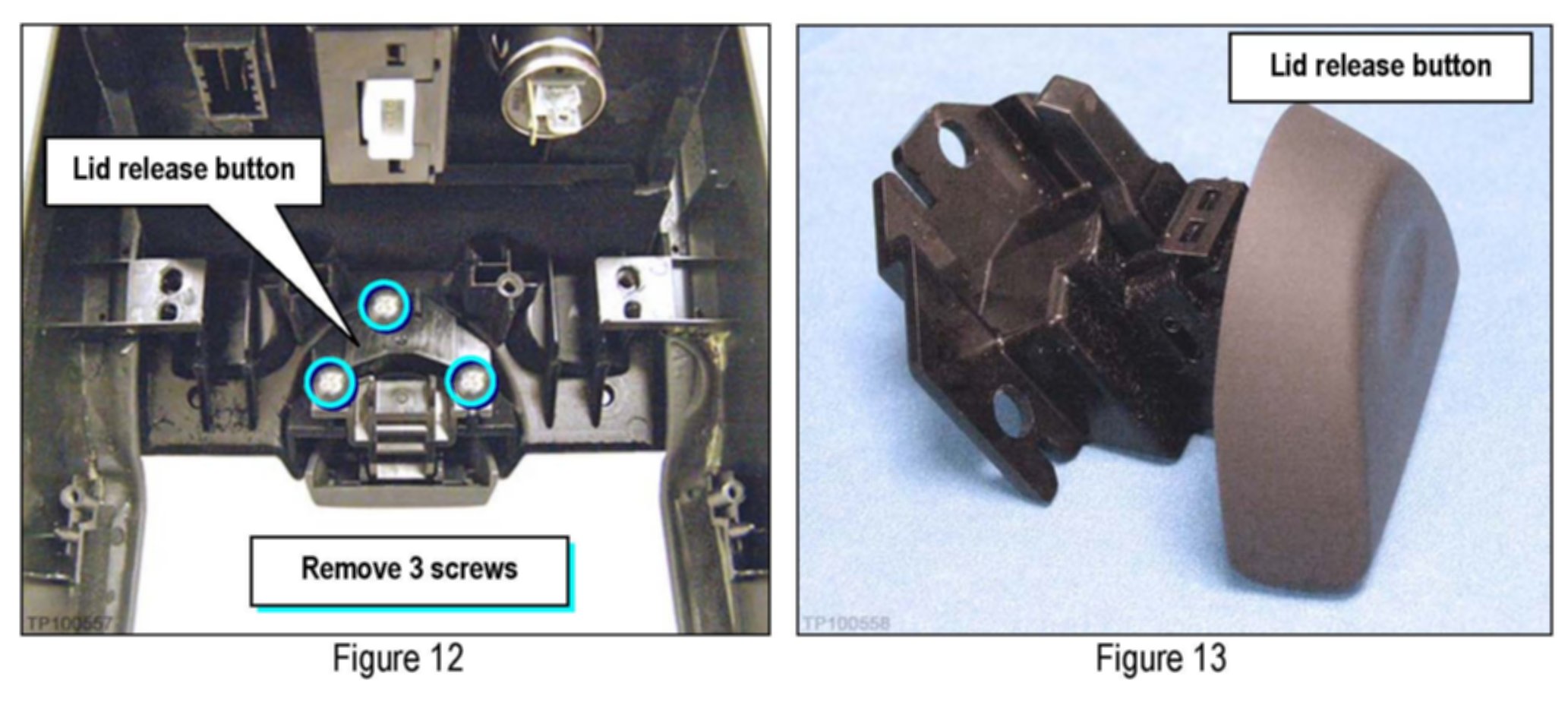 10. Replace the center console lid release button with the part listed in the Parts Information section.