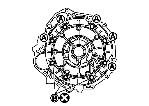 57. Install converter housing to transmission case, and then tighten converter housing bolts (A) and self-sealing bolt (B) to the specified torque.